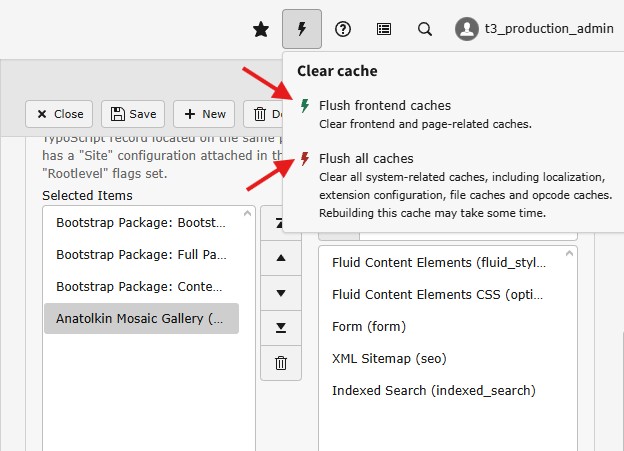- Backend button: click the Flush cache (lightning/fridge) icon in the top bar.